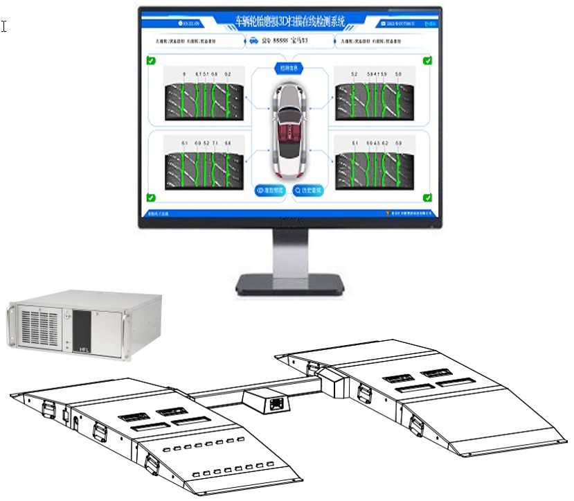 本系統是由北京匯豐隆智能科技有限公司開發并擁有自主知識產權的一款全自動化乘用車輪胎磨損3D掃描在線檢測系統。車主/司機僅需駕駛車輛從檢測系統駛過,檢測系統即可快速、準確的檢測出車輛輪胎的磨損狀態并可在顯示屏或及智能電視上顯示出本次檢測結果。檢測報告具有精度高、速度快、顯示界面信息齊全等特色。同時,檢測報告記錄了被檢測車輛的車牌及車型信息,便于日后方便準確查詢及對比。
